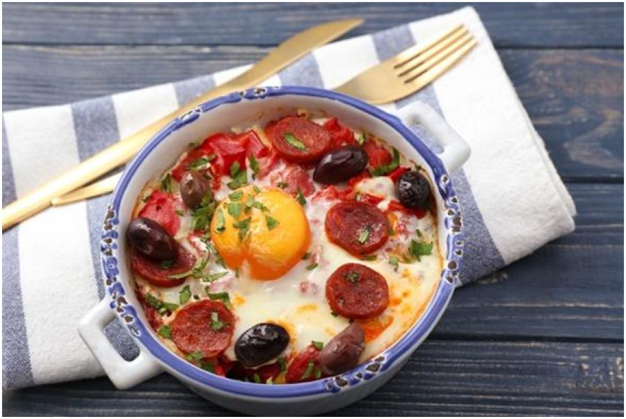 Αβγά στο φούρνο με πικάντικα χωριάτικα λουκάνικα και ελιές / ΤΠ ΠΑΝΤΕΡΗ Πικάντικα Χωριάτικα Λουκάνικα