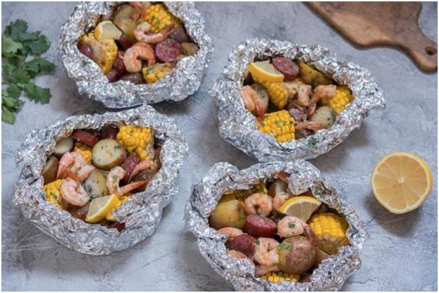 Χωρίζουμε τις γαρίδες, το λουκάνικο, το καλαμπόκι και τις πατάτες σε 4 ίσα μέρη και τα τοποθετούμε στο κέντρο κάθε αλουμινόχαρτου σε μία στρώση.